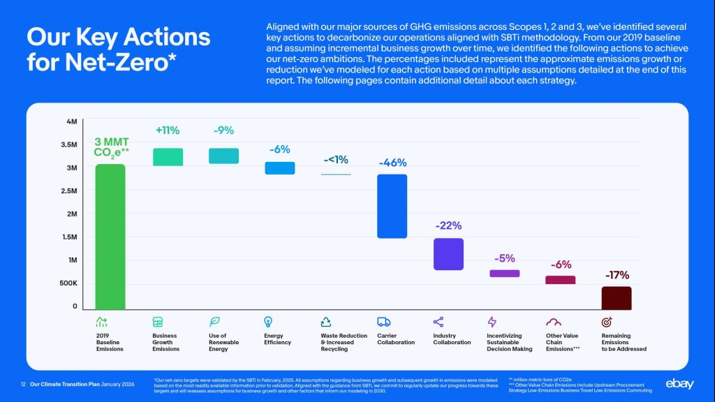 Those commitments were validated in 2025 by the Science Based Targets initiative (SBTi), and the 37-page roadmap published Jan. 14 is a “natural follow-on” to the many cross-function conversations and data-modeling exercises required to come up with the goals, said eBay Chief Sustainability Officer Renee Morin.